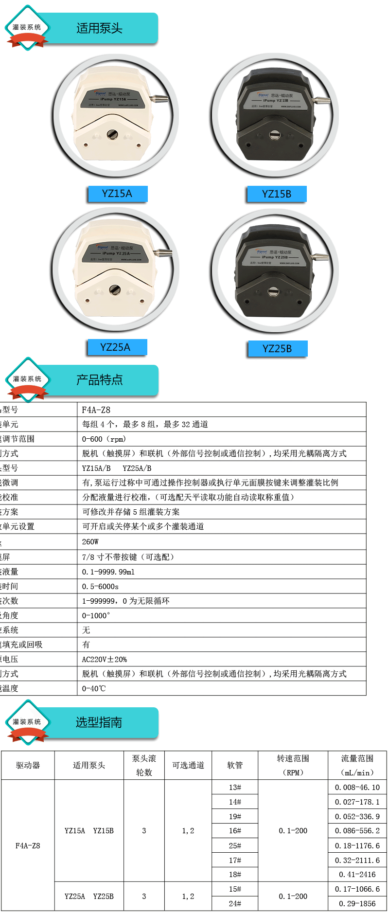 灌裝系統由4組基本通道(可擴展至32通道),一臺控制器組成,可安裝YZ15、YZ25泵頭