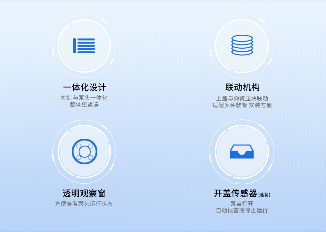 1.流量范圍:<30mL/min 2.控制與泵頭一體化設計,整體更加緊湊 3.上蓋與壓塊聯動機構,安裝軟管更方便 4.彈管壓塊,可適配多種軟管 5.直流電機驅動泵 6.透明觀察窗可方便查看泵頭運行狀態 7.開蓋傳感器(選裝):泵蓋打開,自動報警或:停止運行