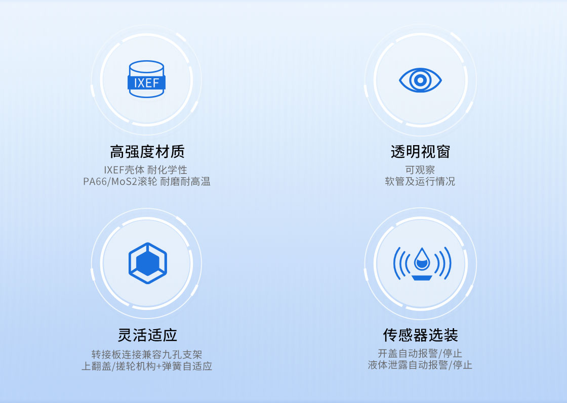 泵頭采用上翻蓋設(shè)計實現(xiàn)快速安裝和更換軟管;