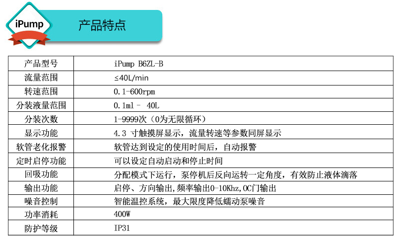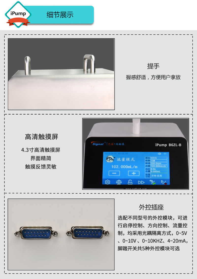 ? ? ? ? ? ?◆流量范圍:≤40L/min ? ? ? ? ? ?◆采用4.3寸高清觸摸屏 ? ? ? ? ? ?◆可實現(xiàn)多泵頭級聯(lián)使用 ? ? ? ? ? ?◆304不銹鋼外殼,易擦拭,耐腐蝕,便于攜帶