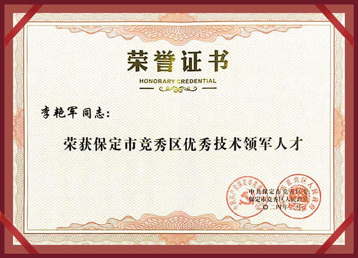 同時,李艷軍先生也榮獲“保定市競秀區優秀技術領軍人才”榮譽稱號,并上臺領取了證書。這個榮譽是對他過去辛勤工作和取得成績的肯定,也是對他未來發展的鼓勵。他表示,這個榮譽將激勵他更加努力,在公司的發展中更加積極地貢獻自己的力量,為競秀區經濟的進一步發展作出更大的貢獻,并由衷的感謝區領導的嘉獎和認可,并表示衷心感激!