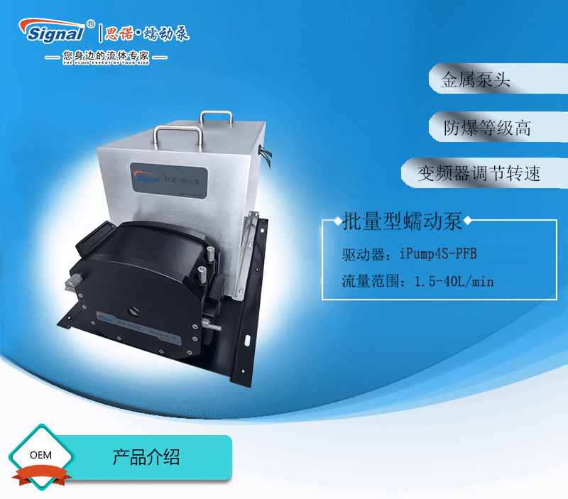 流量范圍:1.5-40L/min 彈性壓管結構,軟管壽命長,非常適合大流量液體傳輸 免維護交流減速電機驅動,變頻器調節轉速 全金屬泵頭,高精度,更可靠 防爆等級DIIBT4,適合易燃易爆環境使用